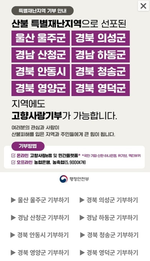 고향사랑e음 기부를 활용하여 산불 피해 지역에 직접적인 도움을 줘 빠른 산불 피해 복구가 될 수 있도록 힘을 모아 주세요. 더불어 세제 혜택과 답례품도 받을 수 있다고 하니 적극적인 참여를 통해 피해 주민들에게 희망을 전하는 데 동참합시다!