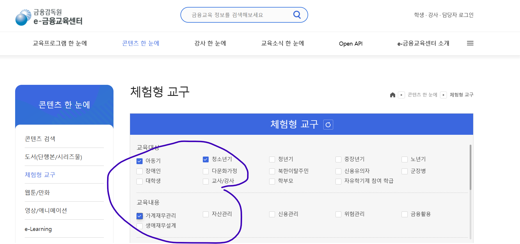 ③ 교육대상 아동기, 청소년기 / 교육내용 가계재무관리 선택 후 아래에 '어디로 갈까요? 용돈 탐험대' 클릭