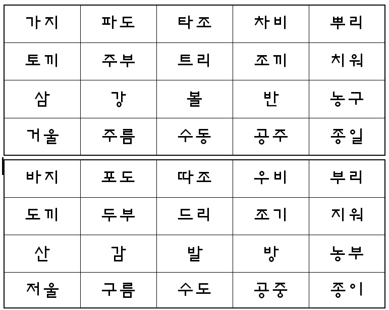 아이들 각각에게 아래의 단어 목록을 제공하여 주었고, 종성이 없는 낱말 10개를 먼저 나무 블럭으로 조합하여 만드는 게임을 진행하였습니다.
