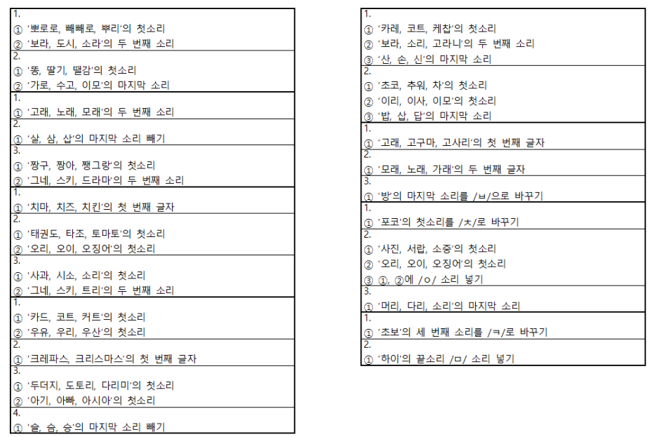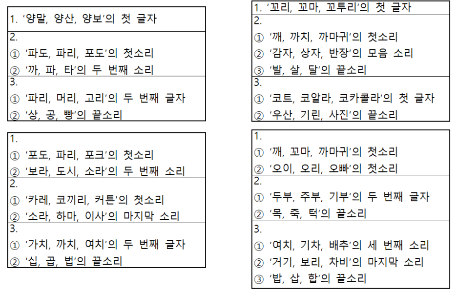 예를 들면, "첫글자는 '뽀로로, 빼빼로, 뿌리'의 첫소리 / '보라, 도시, 소라'의 두번째 소리를 합치세요. 두번째 글자는 '똥, 딸기, 땔감'의 첫소리 / '가로, 수고, 이모'의 마지막 소리를 합치세요." → '뽀또'
