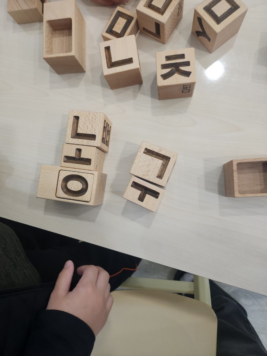 글자를 이루고 있는 초성, 중성, 종성 (자음, 모음) 의 소리에 따른 이해할 수 있도록 한글 나무 블럭으로 종성이 없는 낱말을 조합하는 활동을 먼저 시작하였습니다.
